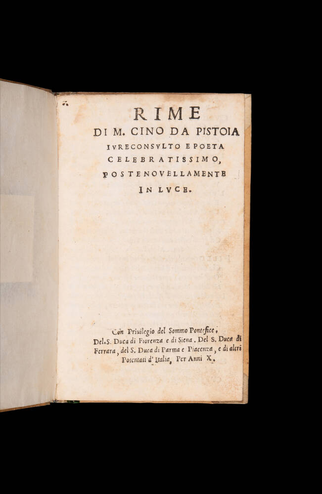 A rare and early edition of the poetic work of Cino da Pistoia (c. 1270–1336/37). A contemporary and friend of Dante's, Cino is recognised as one of the most important Tuscan poets of the Dolce Stil Novo, and influenced Petrarch.