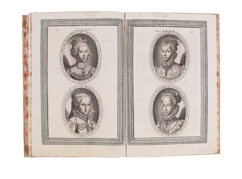 Cremona, Ippolito Tromba e Ercoliano Bartoli., 1585.Folio (402 x 265mm). Allegorical title-page with figures, one winged figure is working on an inscription to Philip II, whose device appears at the head of the title and coat of arms below (with alterated date where it reads 1583), portrait of Philip II in a medallion without cap and 55 small shields with the arms of the states belonging to the Spanish crown, allegory of Cremona on the verso of the second leaf, portrait of Antonio Campo, figure with the Carroccio proceeding from the gates of Cremona, 9 oval portraits of bishops or other illustrious personalities, 24 oval portraits of the dukes and duchesses of Milan with the portrait of Philip II wearing a hat on p.112, plates depicting the baptistery and its plan, the facade of the Cremona Cathedral, the tower and its plan all engraved by Agostino Carracci; the plan of Cremona folded several times and dated 1582, the map of the Contado and Diocese of Cremona engraved by David de Laude , text within woodcut border, woodcut initials and headpieces, with the blank leaf at the end of the third book. Early XVIII century stiff vellum with gilt title on spine, marbled edges. A small wormtrak in the upper white margin of the first five leaves, a very fine wide-margined copy in eighteenth-century stiff vellum with brown morocco lettering-piece on spine from the library of the Zurla family from Crema.