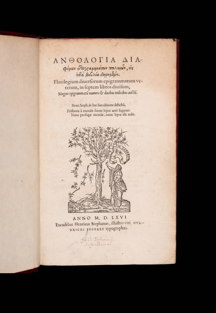 The first Estienne edition of the Greek Anthology. It presents a completely revised text, with some additional epigrams and the scholia of Planudes not in the earlier editions, as well as commentary by Estienne himself.