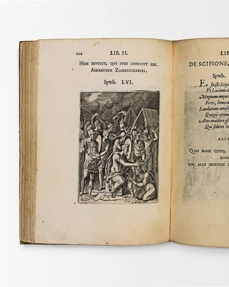 Bologna, apud Societatem Typographiae Bononiensis., 1574.Quarto (205 x 142 mm.), [24] leaves, CCCLVIII pages, xylographic printer’s device on title-page, with an allegorical personification of the city of Bologna and 151 engraved emblems by Giulio Bonasone, after drawings by Prospero Fontana and Parmigianino, retouched for this second edition by Agostino Carracci. A few spots, marginal foxing, upper portion of title page cut away (1 cm.), overall a fine copy in contemporary limp vellum.