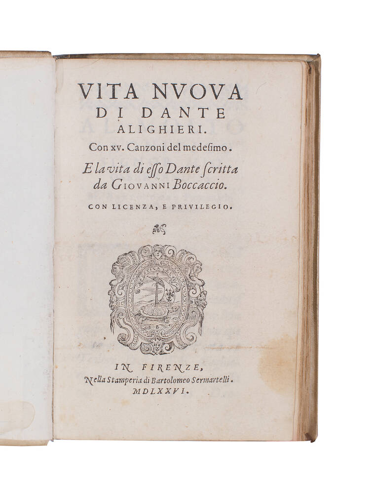 First edition, very rare.'Written between 1293 and 1294, the Vita Nuova is dedicated to Dante's “first friend”, his primo amico, Guido Cavalcanti. The author presents it as an anthology of his early poems, framed within a prose commentary which not only guarantees narrative structure and progression, explaining and revealing the circumstances which inspired the poems, but also functions as a detailed commentary on the 31 poems selected. Structurally, the work is arranged as a diachronic prosimetron, an alternation of prose and poetry (although it seems highly likely that some of the poems were written at the time of the commentary itself), the first of its kind in Italian literature, modelled on Boethius' De consolatione Philosophiae, ascribed in Medieval times to the elegiac genre, to which, as has recently been suggested, Vita Nuova could also belong. In highly idealized and almost hagiographic terms, the narrative traces the story of Dante's love for Beatrice, whose portrayal is highly bound up with the imagery of Christ. The story, however, is based not so much on external events but relates the protagonist's spiritual renewal. His feeling of love is at first a self-centred need, as in the courtly tradition, for his devotion to be rewarded, but then evolves into detached praise for his beloved as the only kind of reward needed to satisfy his desire. The turning point, marked by Donne ch'avete intelletto d'amore, the canzone-manifesto of Dante's stilnovo, is reinforced by Beatrice's death, an almost required condition of genuine, selfless love. The book ends with the promise that he will not speak of Beatrice again, until he is able to “write about her what has never been written of any woman”. The Vita nuova is not only a story of love and spiritual renewal, but also a (highly subjective) means by which Dante takes stock of his own literary career: in other words, the outline of a dual, parallel evolution, in poetry as well as in sentiment.' (internetculturale.it) ‘In the Vita Nuova, Dante—as is universally recognized—gave to the West a myth whereby the love of woman could lead to the love of God. And the arrival at the love of God no longer required the recantation of the love of woman, as it formerly had in Christian thought. By drawing an analogy between Beatrice and Christ, by terming her a “miracle,” by allowing her to participate in the “three-ness” of the Trinity, Dante could transmute his proper function as a lover into a forsaking of possessiveness in favor of an outpouring of praise, trusting that her virtute would lead to his salute. When he repeats the rhyme—a common one—of salvation with virtue, Dante (by his literary power) “guarantees” their connection. The salvation of Dante-the-pilgrim has already occurred when Virgil, who has accompanied Dante through Hell and Purgatory, yields his role as guide to Beatrice. Dante hears from Beatrice, now unveiled, one of the most shining lines of reward in literature: “Guardami ben: io son, io son, Beatrice.” (“Look on me well: I am, I truly am, Beatrice.” At the heights of Paradise, her poet speaks to her for the last time. As Longfellow pointed out, this is the only moment in the Commedia when Dante addresses her in the familiar “tu”: “Tu m'hai di servo tratto a libertate.” (“You have drawn me out of slavery to freedom.”) As the poet praises Beatrice for leading him to liberty, the rhymes take on their wonted“guaranteeing”: salute/vedute/virtute; bontate/libertate/potestate.The Vita Nuova has left many rhetorical and thematic legacies to Western poetry—the disturbances and vacillations of possessive love, the eye as the erotic organ par excellence,the refinement of the mixed genre of prose and poetry, the symmetry of the arrangement of the poetic sequence, the drama of direct address to a beloved, the power of simplicity in language in poems of complex interiority—and for all these bequests the Vita Nuova will continue to be remembered and debated. In their original Italian, the poems will be memorized, pondered, and loved.' (Helen Vendler, The Road to Paradise. The New Republic. October 25, 2012)