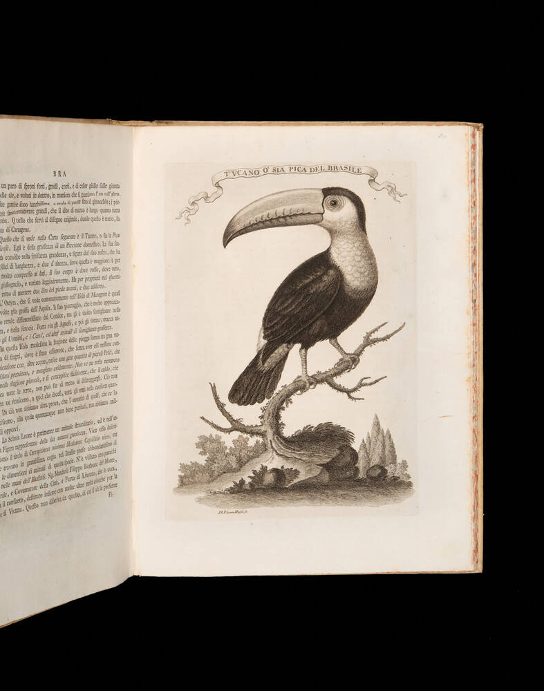 First edition of this luxurious Italian eighteenth-century topographical dictionary of the New World. The work was first published in English a year earlier in an inferior 12mo-format, illustrated only with eight small maps. This Italian edition is virtually a new work, printed in the eighteenth-century rich Italian style on thick paper, with elegant full-page illustrations, folding plates of harbour views, etc. "A comparison of the entries [between the English and Italian editions] shows that although the words were translated literally, the printer, Marco Coltellini, has elevated the cramped, unattractive English original into a handsome book, and the visual effect of the Italian edition is strikingly superior. Because it is a translation of an English work, there is much more information about the English colonies in America than is found in most geographical books written by continental authors up to this time." (Hough, Italians and the Making of America, 81) The text attempts to cover all aspects of the Americas: the land, climate, commerce, goods, government, cities, rivers, mountains, peoples and customs; it is particularly impressive, however, concerning the flora and fauna. A majority of the etched plates are devoted to the indigenous animal and agricultural enterprises, such as a sugar plantation, native cotton manufacturing, tobacco processing, fisheries, and beaver dams, with individual plates of bison, wolverines, porcupines, penguins, Brazilian monkeys, and numerous birds. There are scenes of Barbados, Jamaica, New England, Hudson's Bay, Newfoundland, the Great Lakes, Santo Domingo, Florida, Havana, Lima, Acapulco, Santiago, Boston, New York, Niagara Falls, Quebec, and much more.