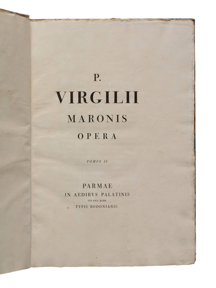 An exceptional copy of one of Bodoni's masterspieces, one of the twenty-five printed on papier d'Annonay. This edition caused Bodoni much displeasure. Firmin Didot, brother of Bodoni's rival Pierre, in a letter addressed to Paul Henry Marron, published in the Magasin Encyclopedique volume V (1794) wrote: “Il paroit, Citoyen, que vous n'avez cherché à decouvrir les fautes dans les éditions de Pierre Didot, que pour consoler Bodoni: mais la reputation de B.est faite; ses livres tiendront, sans doute, un des premiers rangs dans les bibliothèques des amateurs; mais ils seront exclus de celle de Savans. Il est temps, citoyen, quel es hommes de lettres, se réunissent contre les imprimeurs négligens qui croient avoir tout fait lors qu'ils ont employ de beaux caractères et de beau papier, et qui regardent la correction des textes comme des bagatelles…C'est la correction qui a rendu fameuses les éditions des Aldes, celles de Robert Etienne…” This letter ends with the famous statement against Bodoni: “Comme littérateur, je condamne ses éditions, comme typographe je les admire.” This accusation - in his letter Firmin Didot listed 37 philological mistakes in the Virgil - hurted Bodoni for a long time; in 1799 he wrote to his patron de Azara that he as a typograph “ non ambiva al titolo di uomo di lettere, ma erasi limitato a meritarsi un posto distinto nel breve elenco degli artisti operosi e preclari; e che non aveva aspirato mai ad altra gloria che a quella di aver dato potente impulso in Italia e fuori, per richiamare il buon gusto e la primigenia semplicità tipografica che tanto si ammira nelle edizioni del secolo XV”.‘Monumental edition [...] The typographic design of Bodoni's Virgil is one of the highlights of neoclassicism: the layout is geometric and the letters seem to swim in a sea of white. The printing is perfect in all technical aspects'. (Lommen, The book of books, London, 2012)