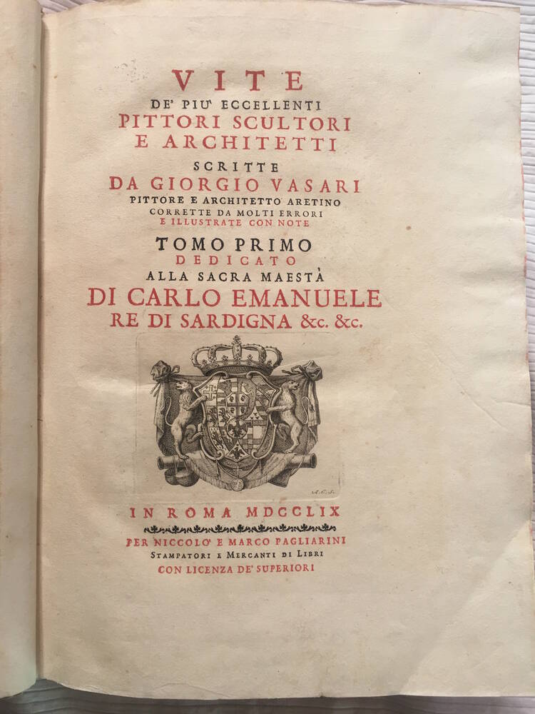 Roma, per Niccolò e Marco Pagliarini., 1759 - 1760.Three volumes, in quarto (260 x 180mm.) with 3 engraved frontispieces, 2 folding plates and 157 portraits. Title pages printed in red and black with vignettes. A very fine copy on larege paper bound in contemporary vellum with gilt titles on spine. The frontispiece of Volume I is signed as designed by Gioachino Martorani and engraved by Ant. Capellan; the other two frontispieces are unsigned.. None of the other plates is signed, apart from plate [11] of Volume III, which is signed as engraved by Ant. Capellan. The three title-page vignettes are signed as engraved by A[nt]. C[apellan]. The headpiece of the life of Michelangelo in Volume III is signed as engraved by 'VF'. The woodcut head- and tail-pieces are unsigned. First edition by Bottari highly estimated. "The portraits, proof copies without letterpress on the back, are engraved copies by Bartolozzi and Antonio Capellani of the woodcuts of the 1568 edition" (Fowler). This edition is highly esteemed for the valuable notes by Giovanni Gaetano Bottari (who curated it) and Mariette, and many of the portraits are masterfully executed by Bartolozzi" (Ebert).